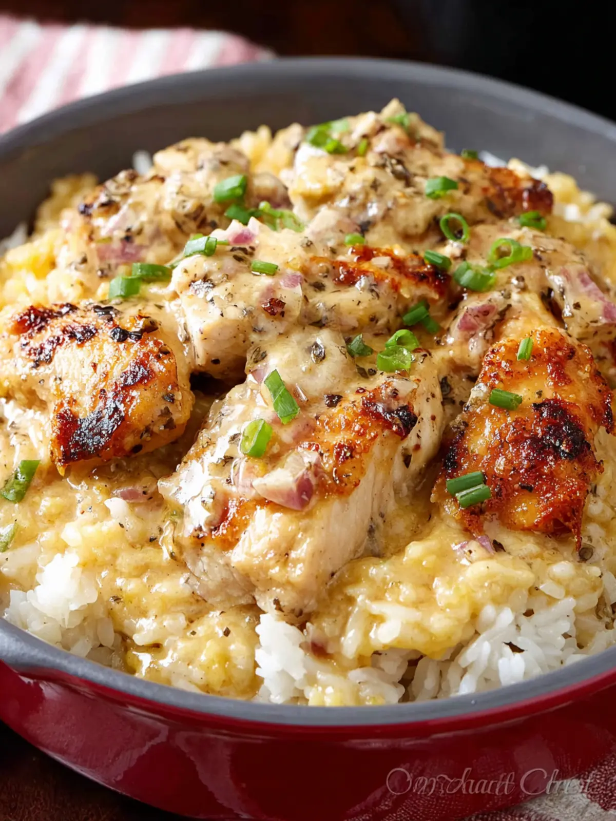 - Pour the cream mixture over the rice and stir gently. Place the browned chicken on top in a single layer.