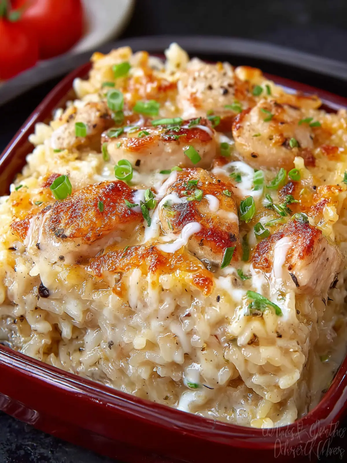 A comforting creamy chicken and rice bake that is easy to prepare and perfect for a family dinner.