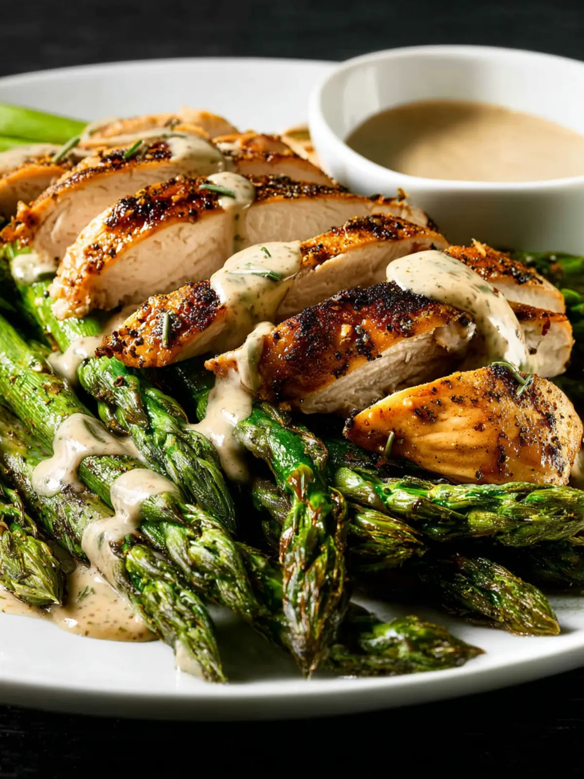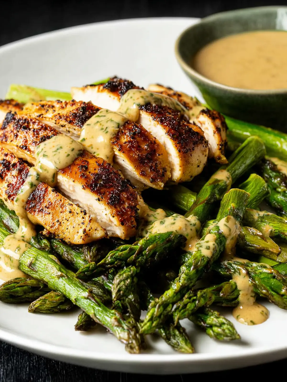 A delicious and healthy chicken and asparagus dish served with a creamy tahini sauce.