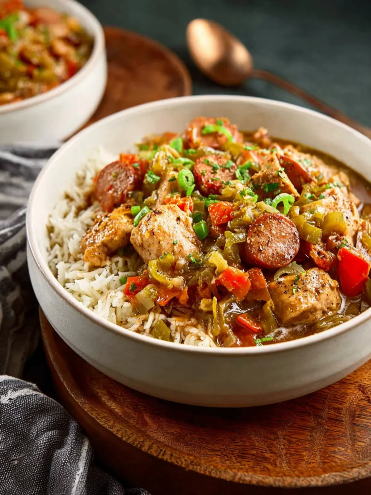 A hearty gumbo featuring chicken and Andouille sausage, perfect for a comforting meal.