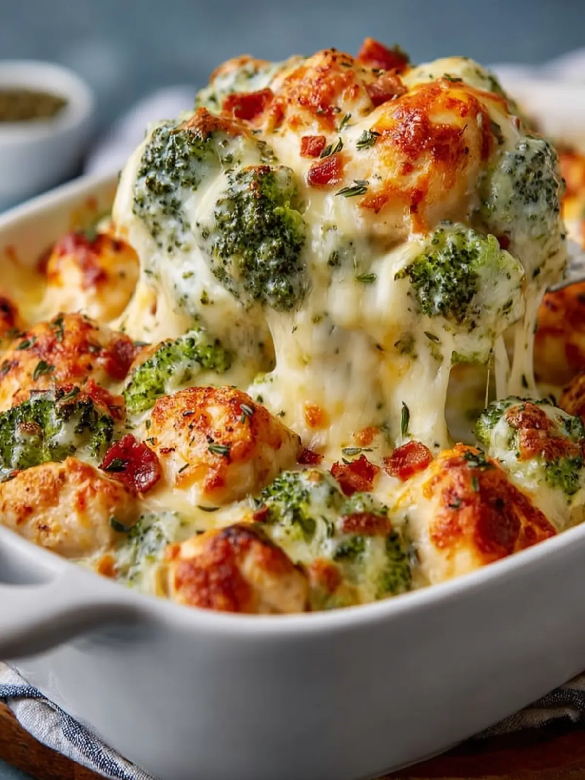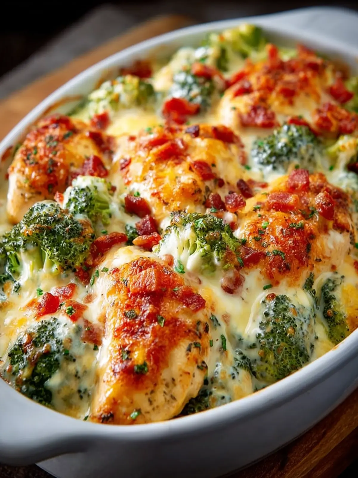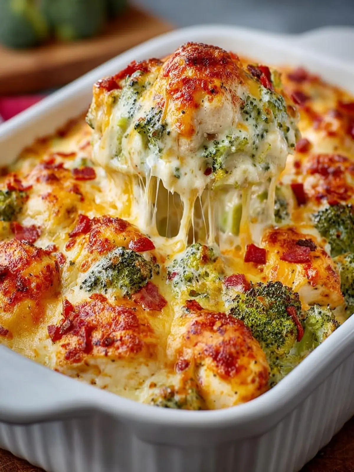 A delicious and hearty creamy bake featuring chicken, broccoli, and a blend of melted cheeses.