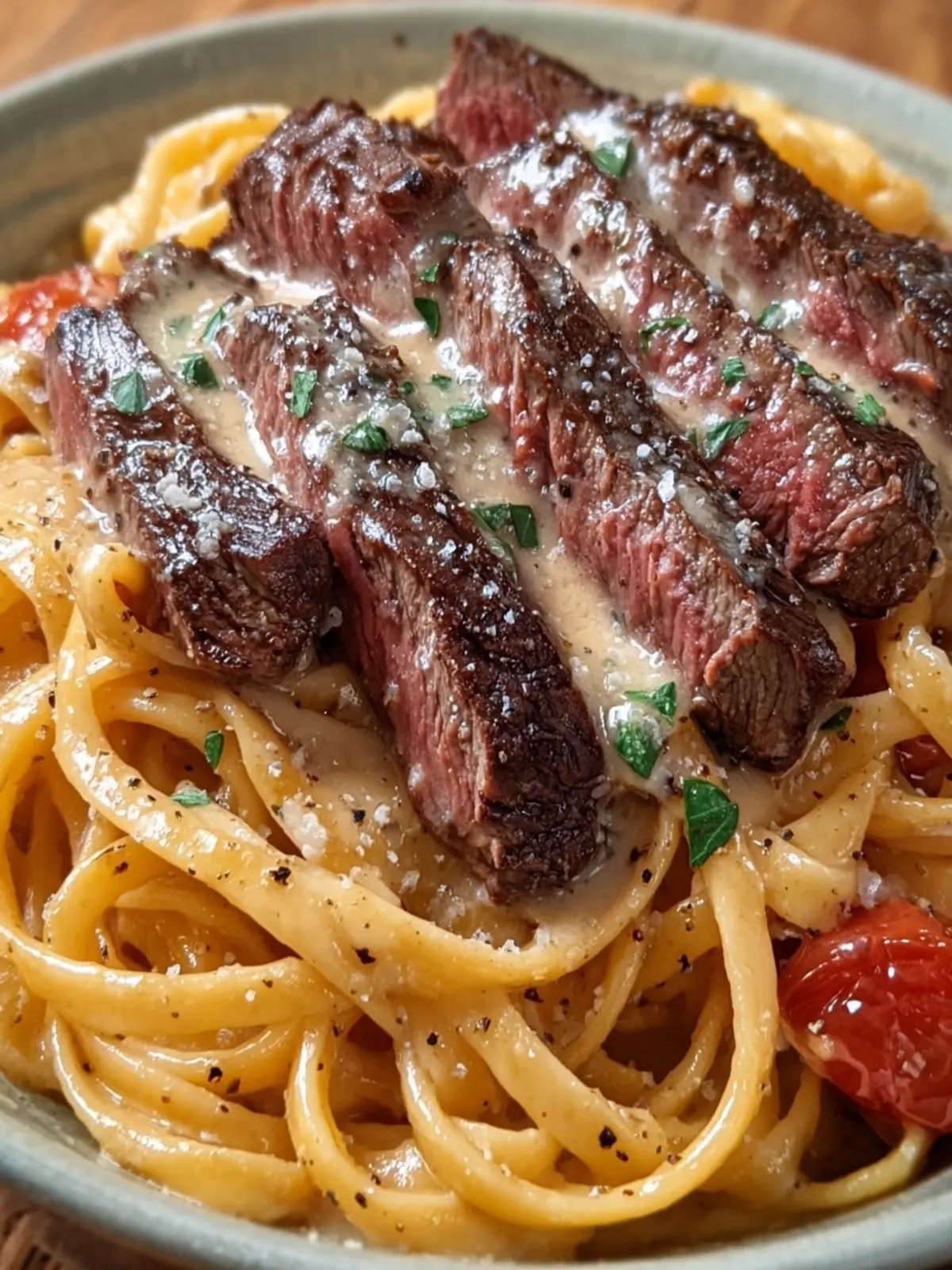 – Serve the creamy Alfredo pasta on plates and top with sliced steak.