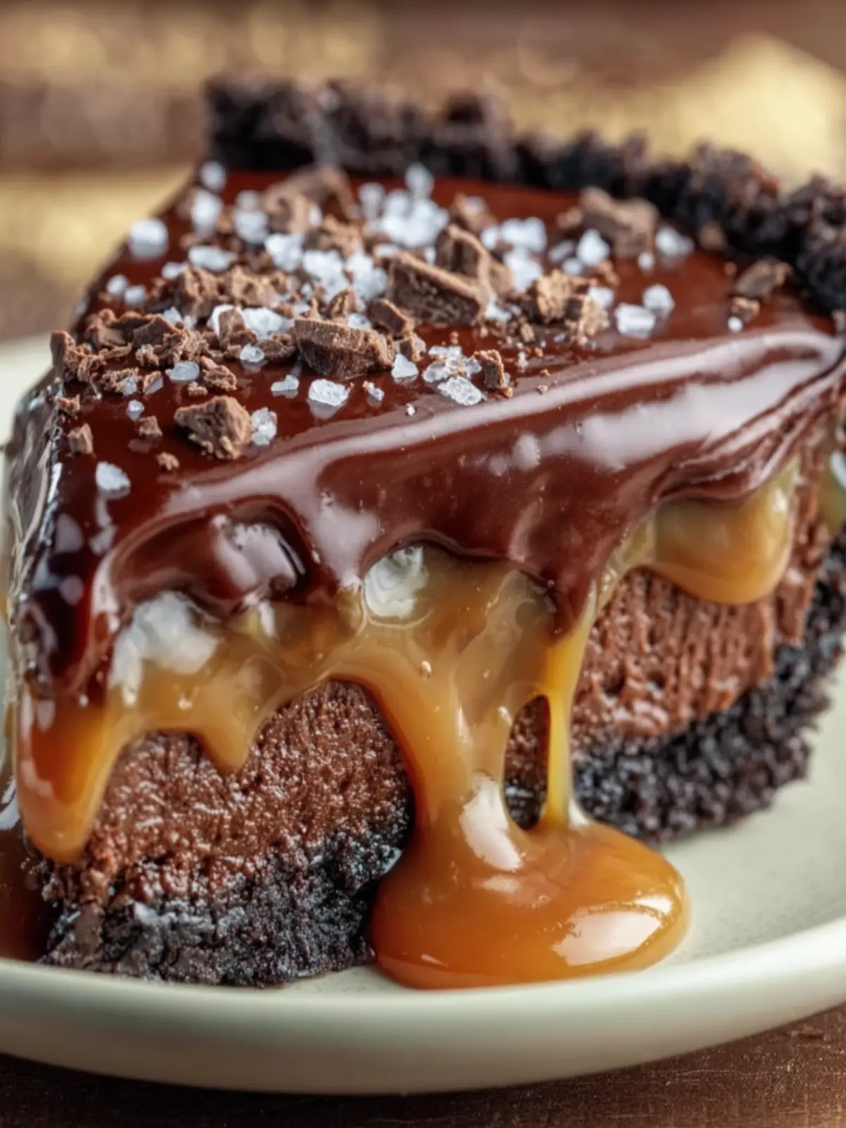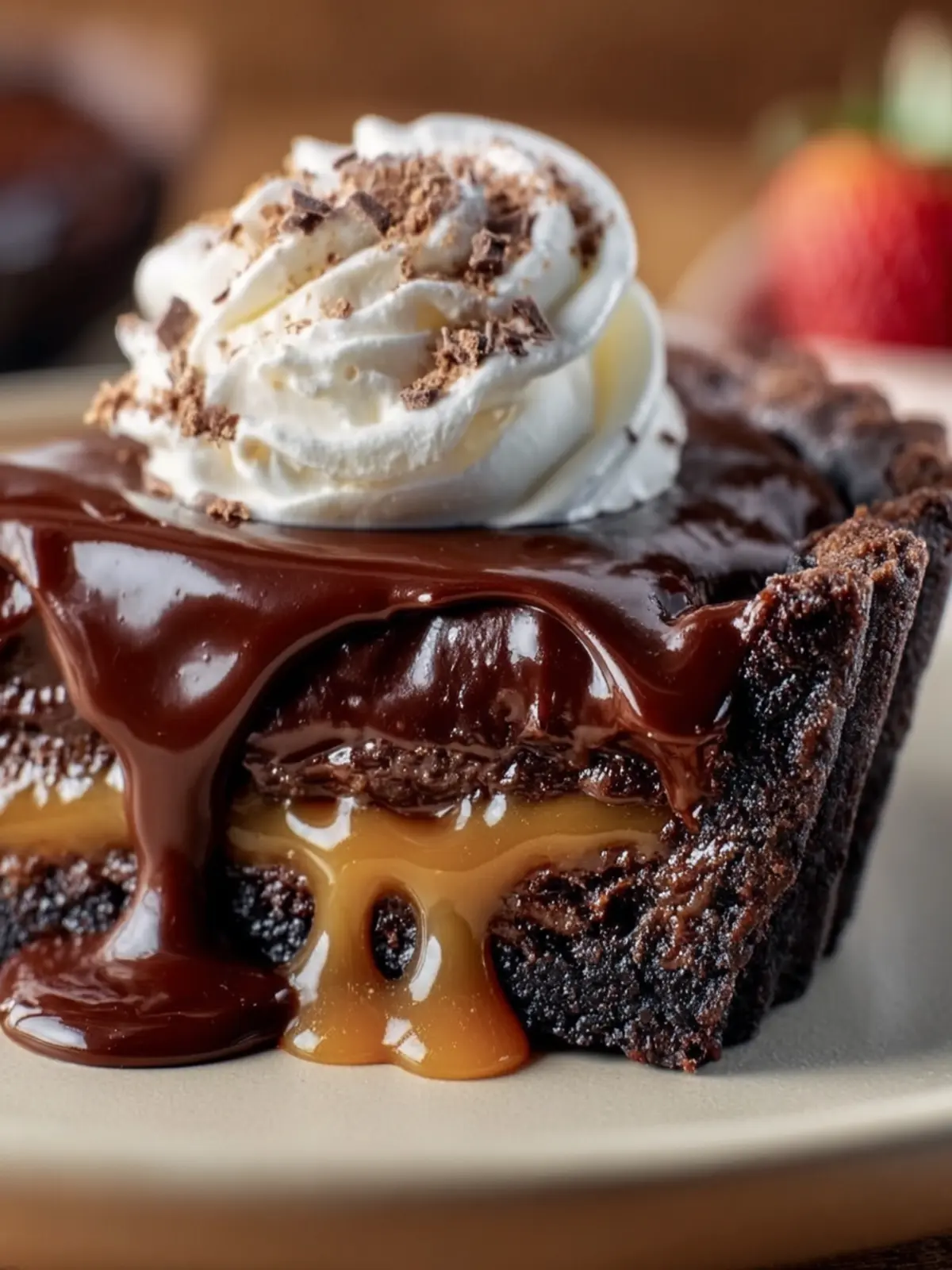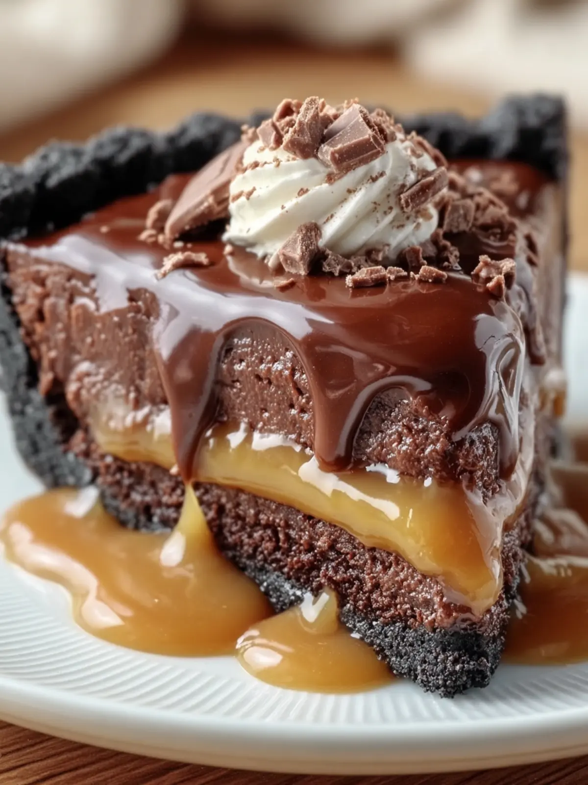 A rich and indulgent dessert featuring a chocolate crust, caramel filling, and chocolate ganache.