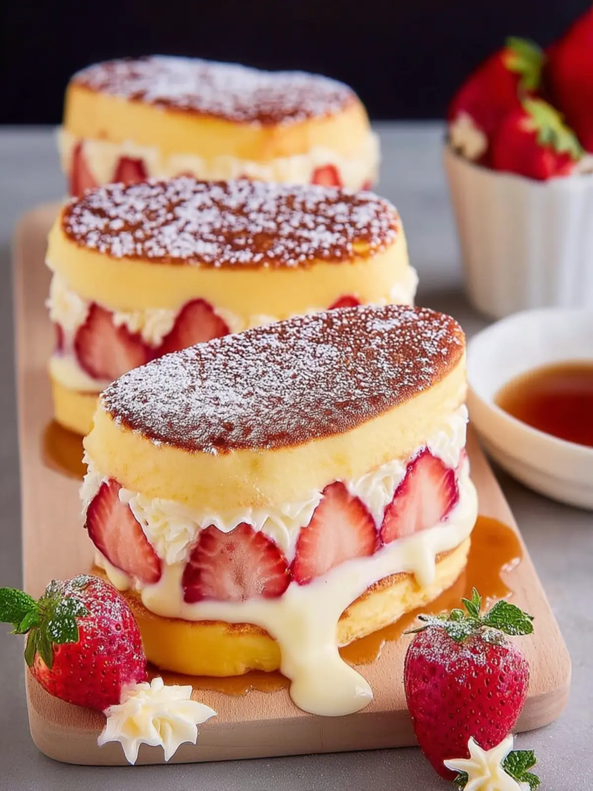 - Assemble Sandwiches: Take one pancake as the base. Spread a layer of whipped cream over it. Arrange sliced strawberries over the cream. Spread another layer of whipped cream and top with another pancake.