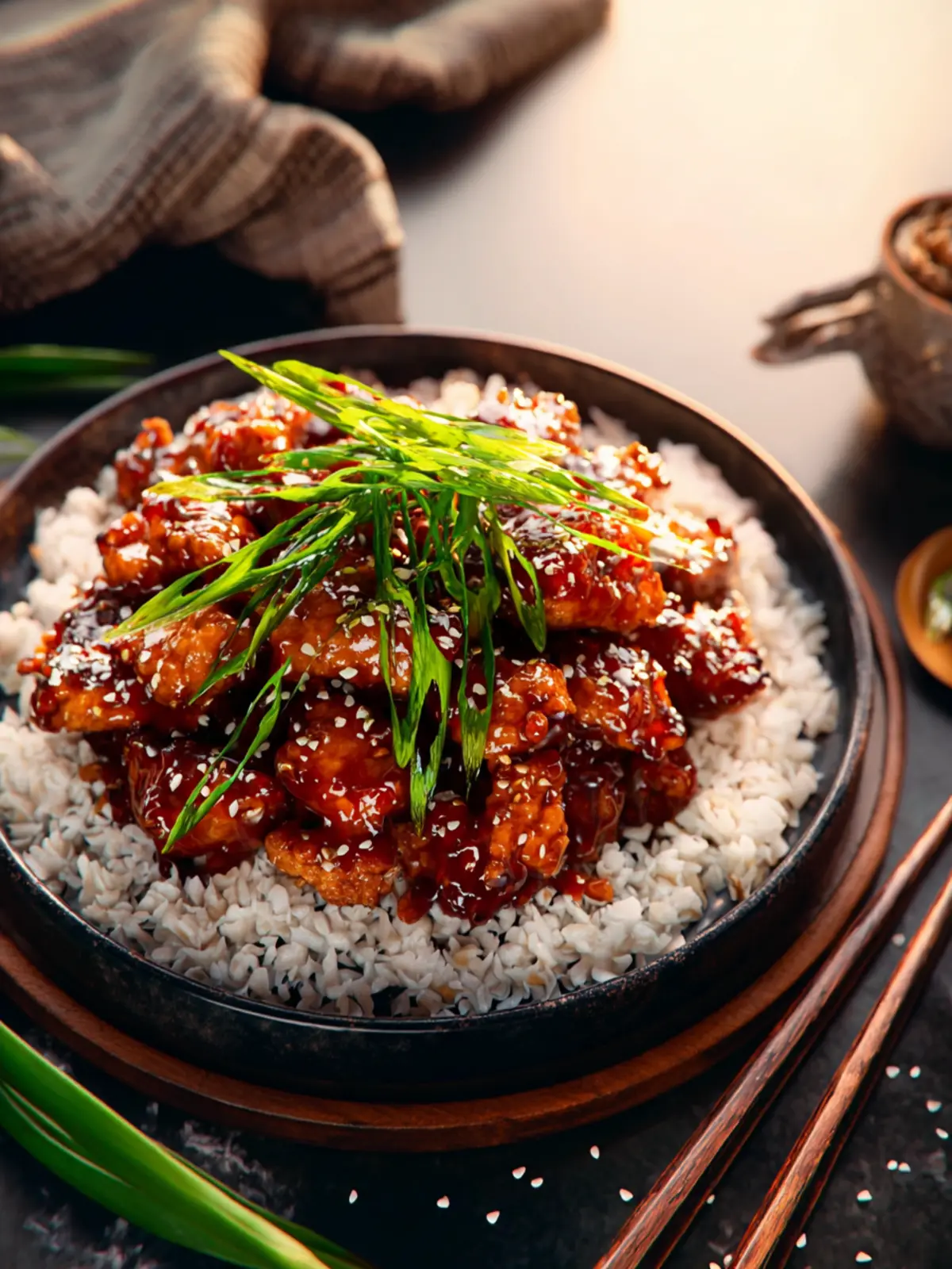 This crispy chicken dish is coated in a sweet and spicy gochujang sauce, perfect for serving over rice.