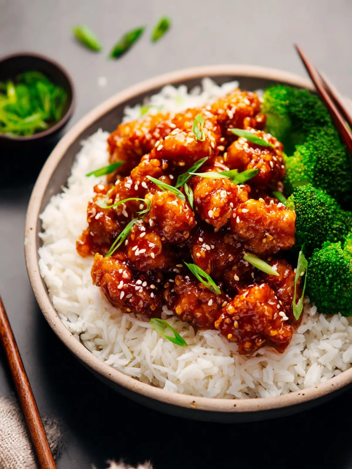 - Pour as much sauce as you’d like over the cut-up chicken pieces (you may not want it all depending on how saucy you prefer your meal). Drizzle the remaining 2 teaspoons sesame oil on top of the coated chicken. Gently toss and serve immediately. I like to serve over cooked rice with sesame seeds and thinly sliced green onions.