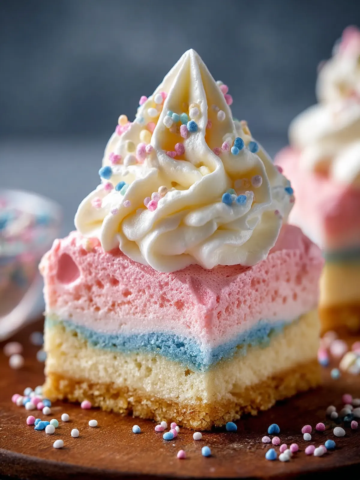 - Assemble the Cake: Place one cake layer on a serving plate. Spread a layer of white meringue over the top. Add the second cake layer. Spread a thin layer of blue meringue followed by a thicker layer of pink meringue on top.