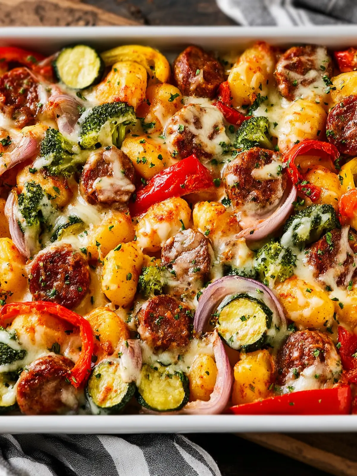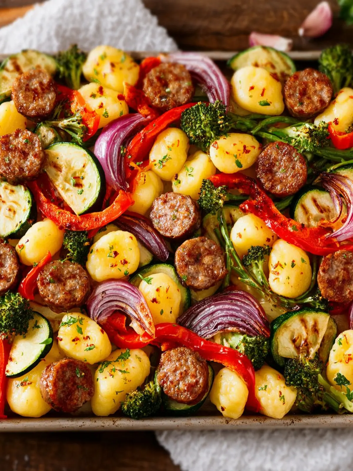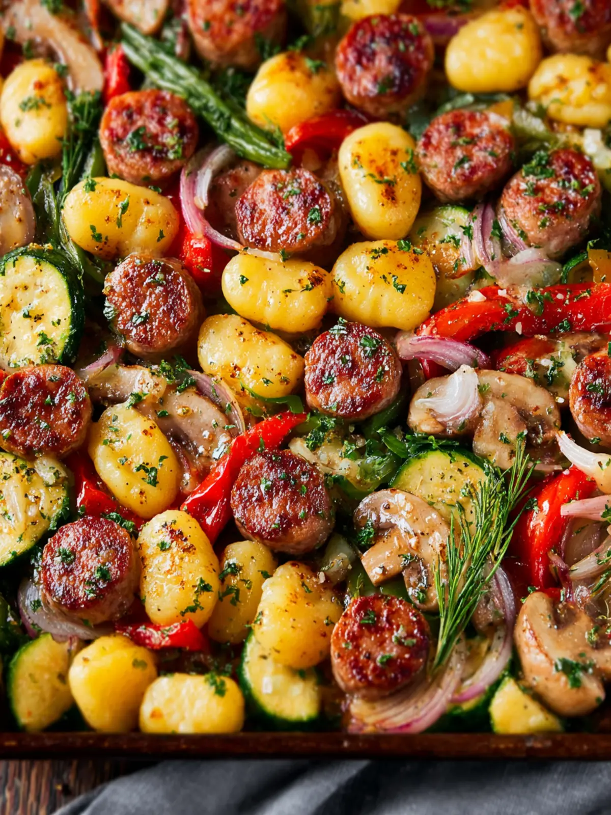 Vegetables: Fresh vegetables like bell peppers, zucchini, and red onions bring the meal to life. Roasting them alongside the gnocchi and sausage enhances their natural sweetness and creates a colorful, nutritious dinner.