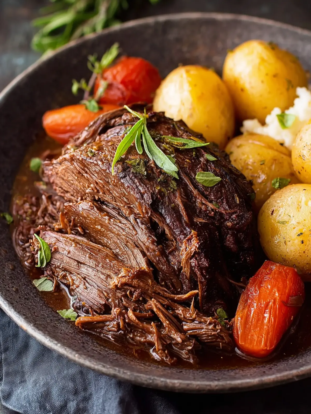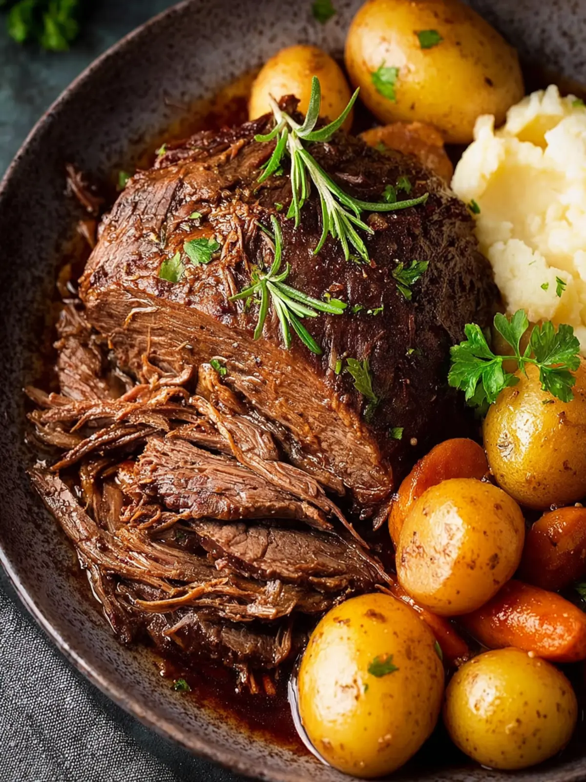 A delicious slow-cooked beef roast with vegetables, perfect for family dinners.