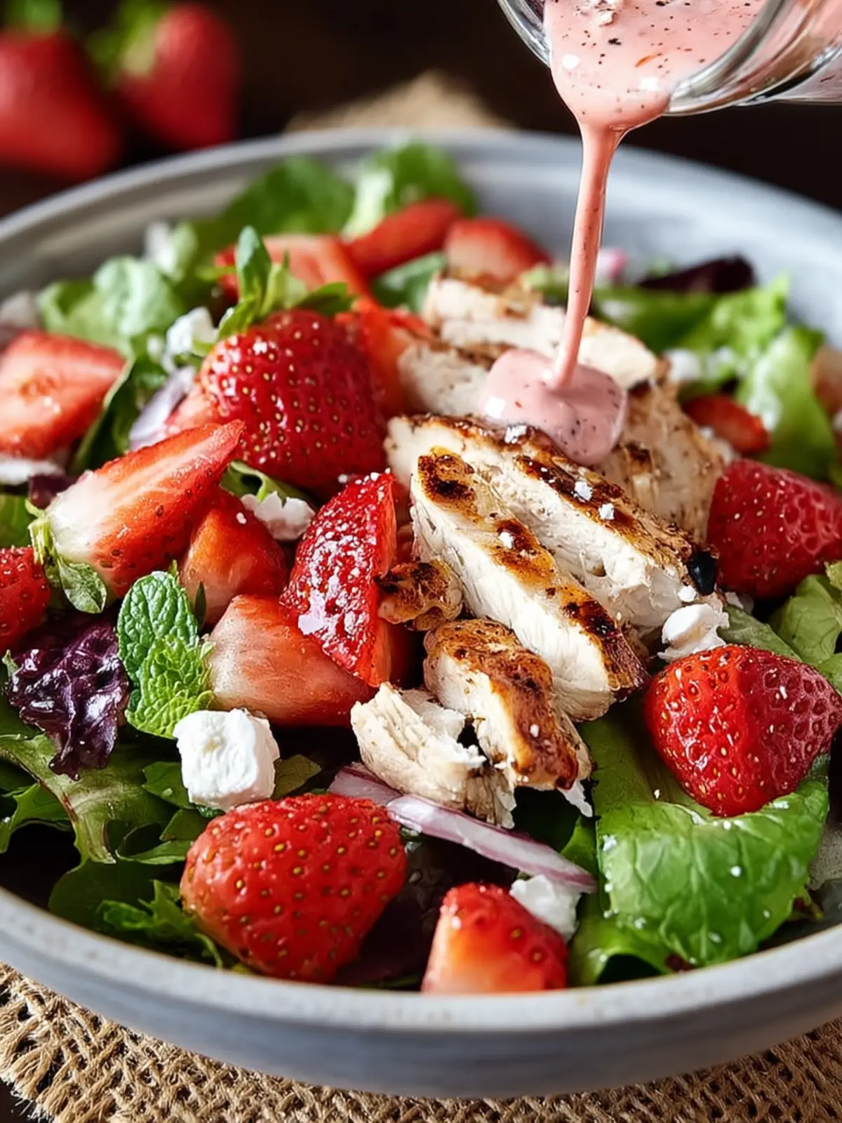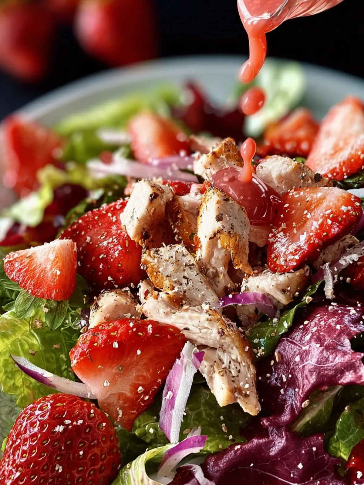 For a café-style presentation, layer your salad by placing the greens first, followed by chicken, and topping it off with strawberries and nuts. A sprinkle of feta or goat cheese adds a touch of creaminess and elegance.