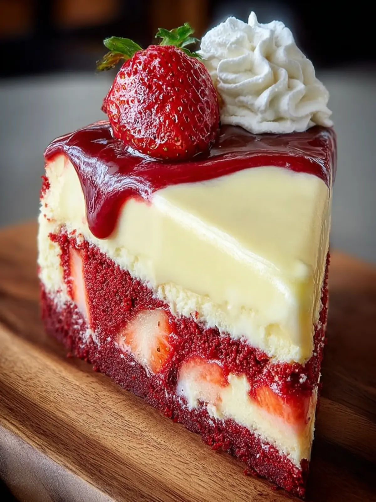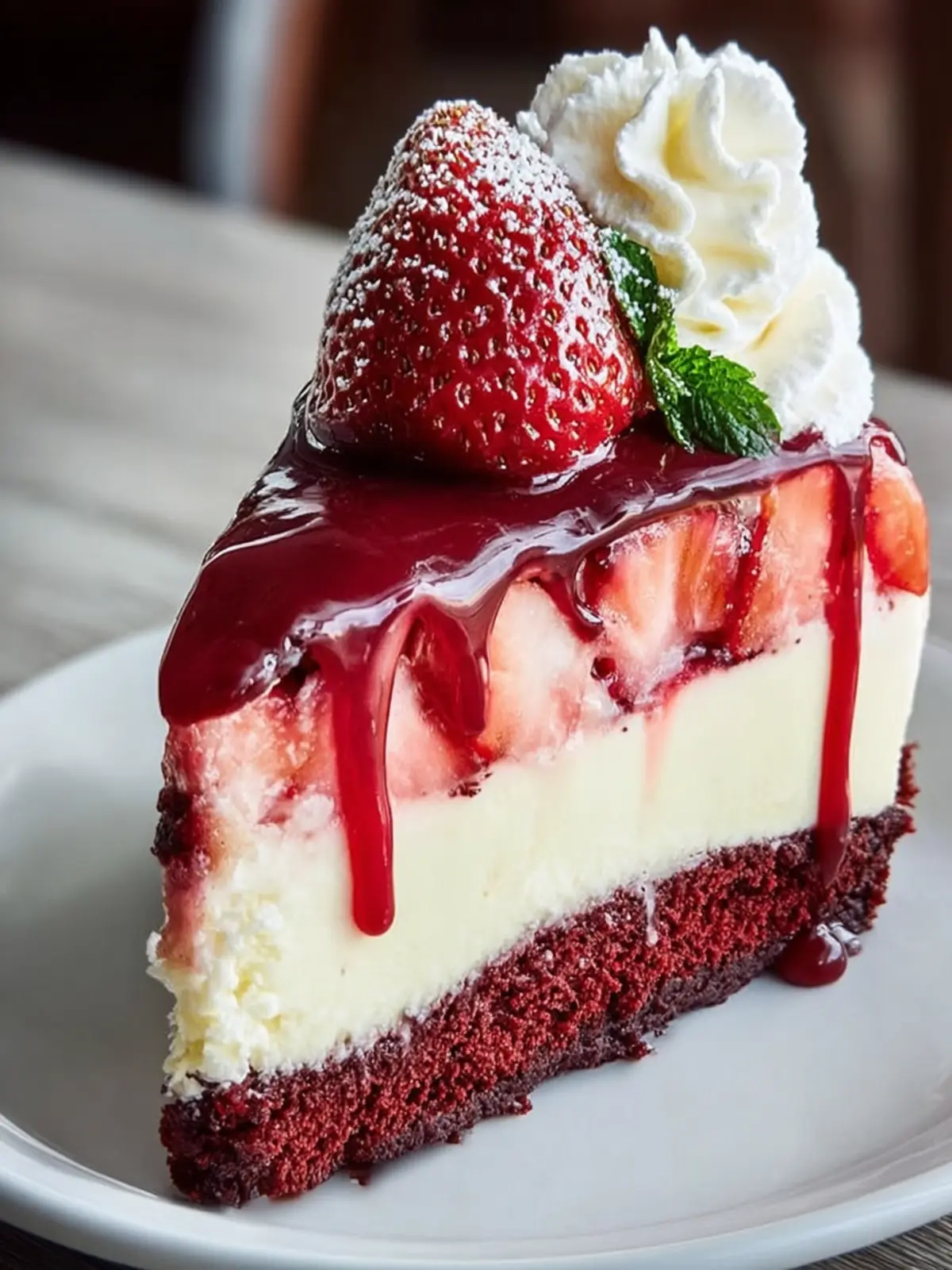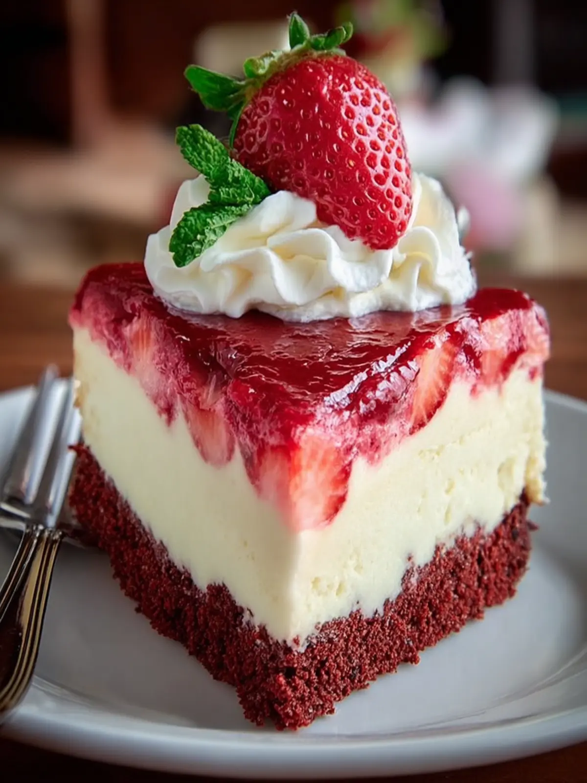 Indulge in this delicious Strawberry Red Velvet Cheesecake Slice that combines the rich flavors of red velvet cake with a creamy cheesecake layer topped with strawberry preserves and fresh strawberries.